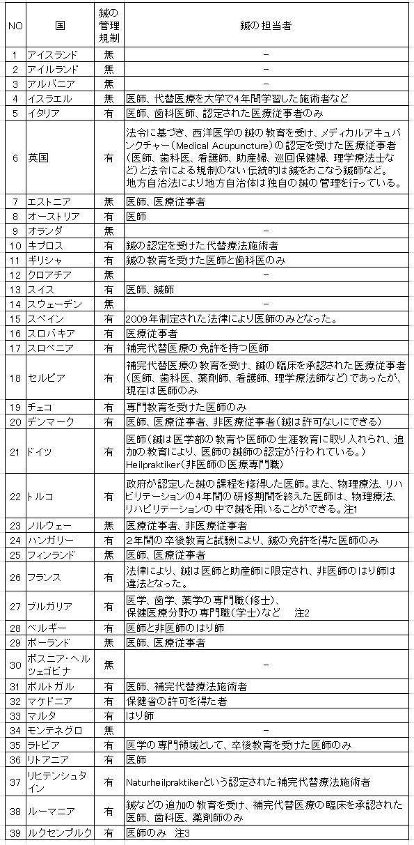 *아래 자료는 다소 시간이 경과된 것이기는 하나, 유럽 전반에 걸친 침술제도에 대해 개관하고 있다. 자료는 아래 일본의 침구의료보급기구 사이트에 게재된 것이다.