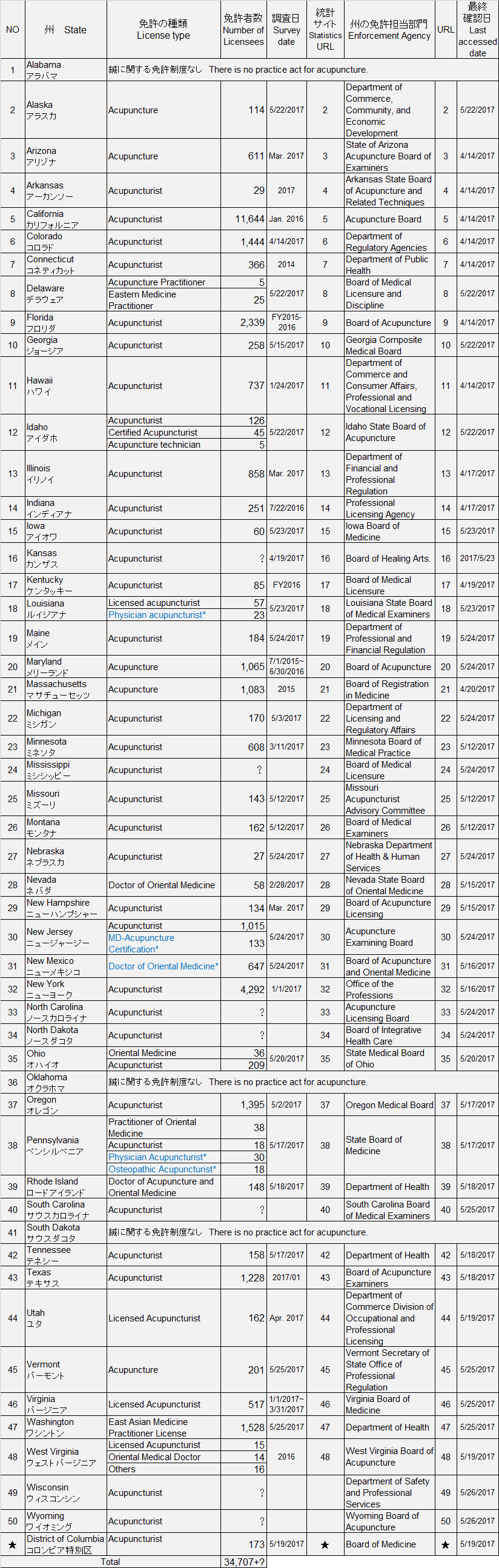 2017년 5월 말 현재 침술 면허제도가 없는 주는 3개이다.