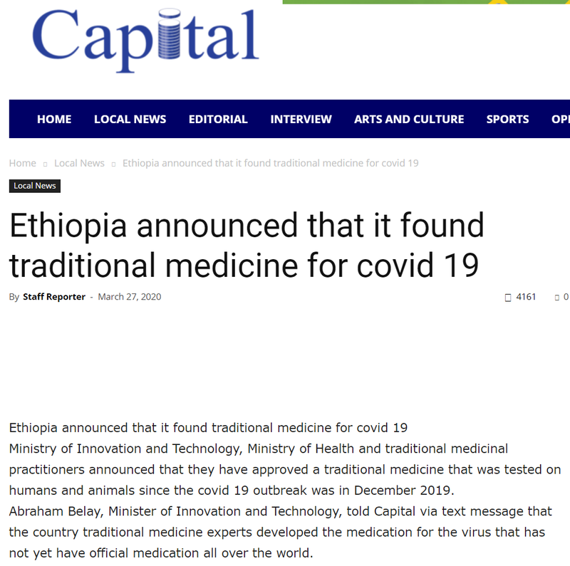 에티오피아는 Covid -19에 대응한 전통의학 요법을 찾아냈발다고 발표했다.