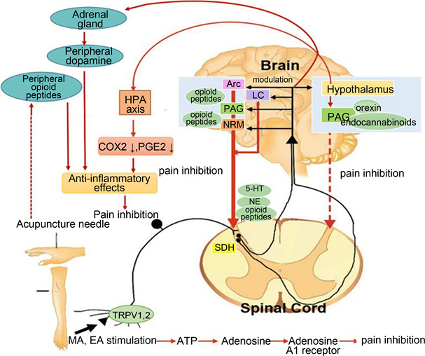 침술 진통의 잠재적인 생리학적 메커니즘은 대략 말초적 메커니즘과 중추적 메커니즘으로 나눌 수 있다.6] 그 중 통증 관리에 관련된 가장 통합된 시스템은 내인성 오피오이드 시스템이다. 신경전달물질의 변화도 진통에 영향을 미칠 수 있다. 침술에 의해 생성된 척수의 분절적 억제는 압박 통증 역치를 증가시킬 수 있다. 최근 과학자들은 침술의 통증 치료 메커니즘에서도 진전을 이루었다. 현재 통증 자극은 구심경로를 통해 중추신경계로 유입되어 대뇌변연계와 대뇌피질에 도달하고, 척수, 뇌간, 시상하부와 같은 릴레이 기구를 거쳐 최종적으로 신경자극으로 전환되어 중추신경계를 통해 통합되어 통증과 통증 반응을 생성한다고 생각된다.7] , 침술 자극은 근육의 A-델타 및 C 구심섬유를 활성화시켜 척수로 신호가 전달되고, 이로 인해 카르노신 및 엔케팔린과 같은 물질이 국소적으로 방출된다. 이러한 구심신경은 중뇌로 전달되어 척수에서 흥분성 및 억제성 매개체의 연쇄 반응을 촉발한다. 이 시점에서 생성된 신경전달물질은 척수로 방출되어, 시냅스 전과 시냅스 후 억제 작용을 형성하고 통증 전달을 억제한다. 이 신호가 시상하부, 뇌하수체 등으로 전달되면 엔돌핀과 부신피질자극호르몬이 분비된다. 이는 통증 역치를 높이고, 통증 내성을 높이고, 통증 민감도를 낮추고, 생리적 기능을 조절하는 데 도움이 될 수 있다.8], 이로써 진통 효과가 생성되는 것이다. 침술 진통의 과정은 중추, 말초, 면역, 분자적 측면 등 여러 측면을 포함하고 있으며, 신경핵, 신호전달경로, 면역반응, 신경섬유, 신경전달물질, 호르몬 등의 공동작용을 통해 진통효과를 발휘하며, 역동적인 네트워크 과정으로 여겨진다. 그림 1 [9] 참도