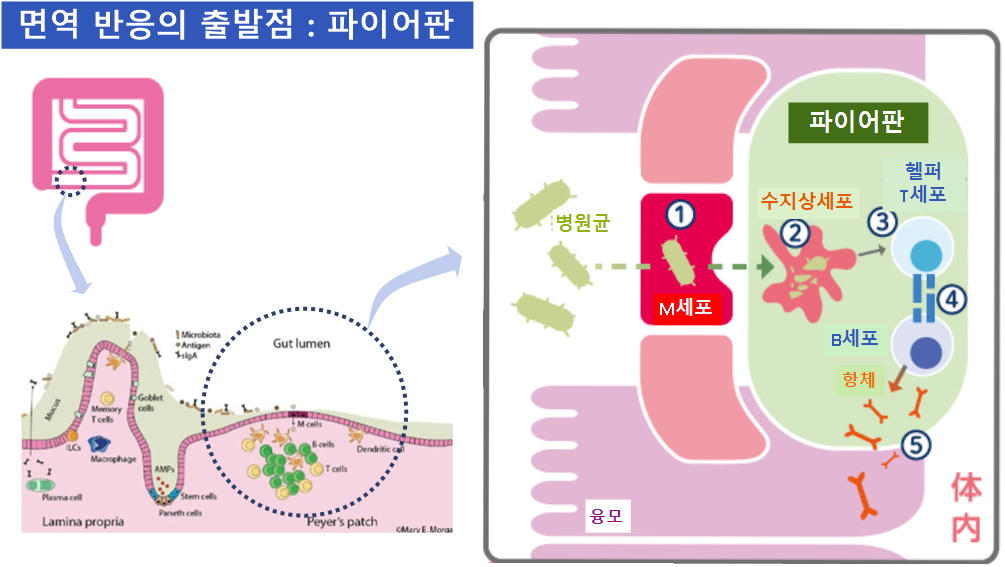 - 면역 반응의 출발점 : 파이어판(Peyer's patch)