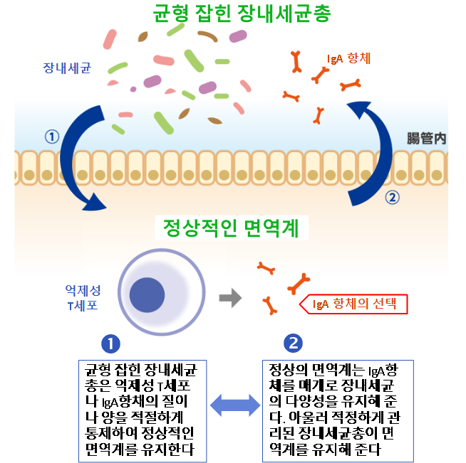그동안 좋은 장내세균 균형이 장관 면역계를 활성화하고 건강으로 이어진다는 것은 알려져 있었지만 이 반대의 흐름에 대해서는 잘 알지 못했다. 그런데 최근 연구에서 장관 면역계에서도 좋은 장내세균 균형을 적극적으로 유지하고 있다는 사실이 밝혀지고 있다. 즉, 장내세균과 장관 면역계는 서로 관계하는 양방향의 교류가 있고, 그것으로 건강이 유지되고 있다는 것이다.