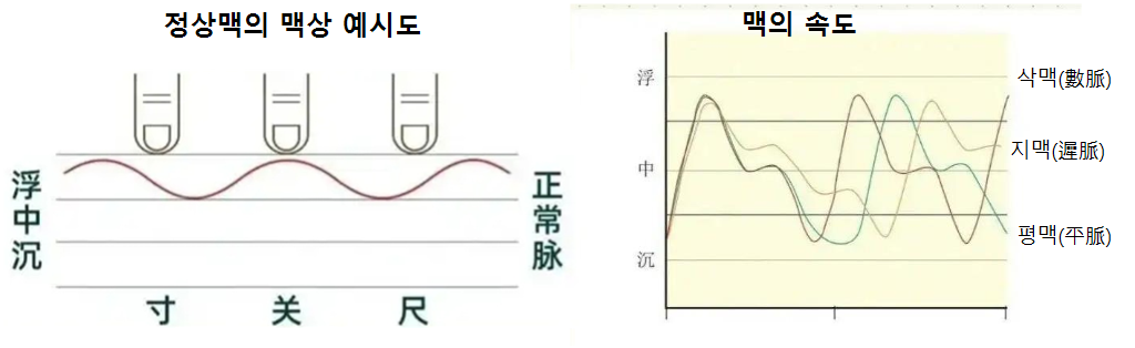 맥진시 정상맥의 맥상은 다음 그림과 같은 이미지로 이해될 수 있다고 본다. 맥의 속도도 함께 참고할 수 있다. 평맥(平脈)의 경우 1호흡(한번 내쉬고 한번 들이쉼)에 4~5회 정도로 1분당 70-80회 맥박에 해당하고, 지맥(遲脈)은 1호흡에 4회 미만으로 1분당 60회 미만의 맥박에 해당하며, 삭맥(數脈)은 1호흡에 5회 이상으로 1분당 80회 이상의 맥박을 보인다. 삭맥 가운데서도 1분당 130회 이상을 넘어서면 질맥(疾脈)으로 구분된다.