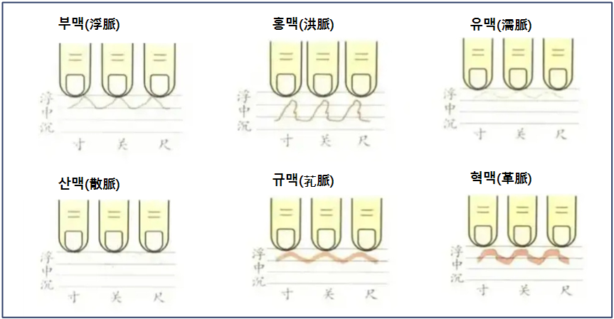 *맥상에 대한 이하의 설명은 매우 도식적인 것인 만큼 참고로만 활용하여야 할 것입니다. 맥의 상은 줄곧 변화하기도 하며, 그 상을 판별하는 일도 쉽지 않기 때문입니다. 다만 이러한 구분과 설명이 맥진의 초보적 가이드 역할은 할 수 있을 것으로 여겨져 정리해 둡니다.