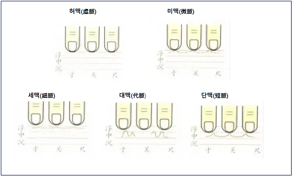 脈象:가볍게 눌러(輕取) 취하데 약하지만 공간이 비지 않게 약한 강도로 눌러 취한다.