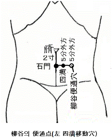 郡山七二는 상전장골극에서 치골 결합까지 10cm 정도의 서혜부 구간의 2~3개의 곳애 3㎝ 정도 자침하면 S상결장에 이른다(<現代針灸治法録>)라고 했다.