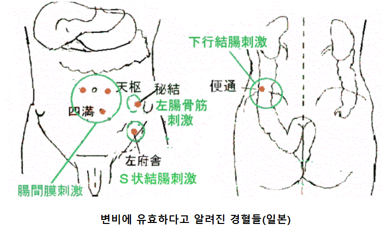 변비에 효과가 있다고 알려진 경혈(특수혈)과 그 침법에 대해 일본 침구사 및 학자들의 견해에 대해 정리해 둔다. 전통적으로 천추, 복결 등이 추천되는데, 그외 특수한 혈자리로 변통혈, (좌)사만이동혈(변통점), 비결, 좌(부사) 등이 특효혈로 제시되고 있다. 이들 특효혈들은 하행결장이나 S상결장을 직접 자극하는 침법으로 이해된다. 또 장간막과 (좌)장골근 등의 직접적인 자극을 의도하는 것도 있다. 따라서 실제 활용을 위해서는 해부학적 지식과 숙련이 요망된다는 점에 유의해야 할 것이다.