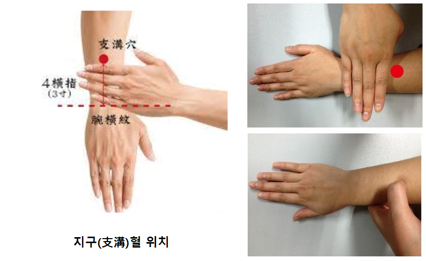마지막으로 일상에서 변비 현상에 부딪혔을 때, 도움을 구할 수 있는 방안에 대해 소개해 둔다. 여러가지가 있겠지만, 팔에 있는 '지구'혈을 활용하여 도움을 얻는 방법을 소개한다.