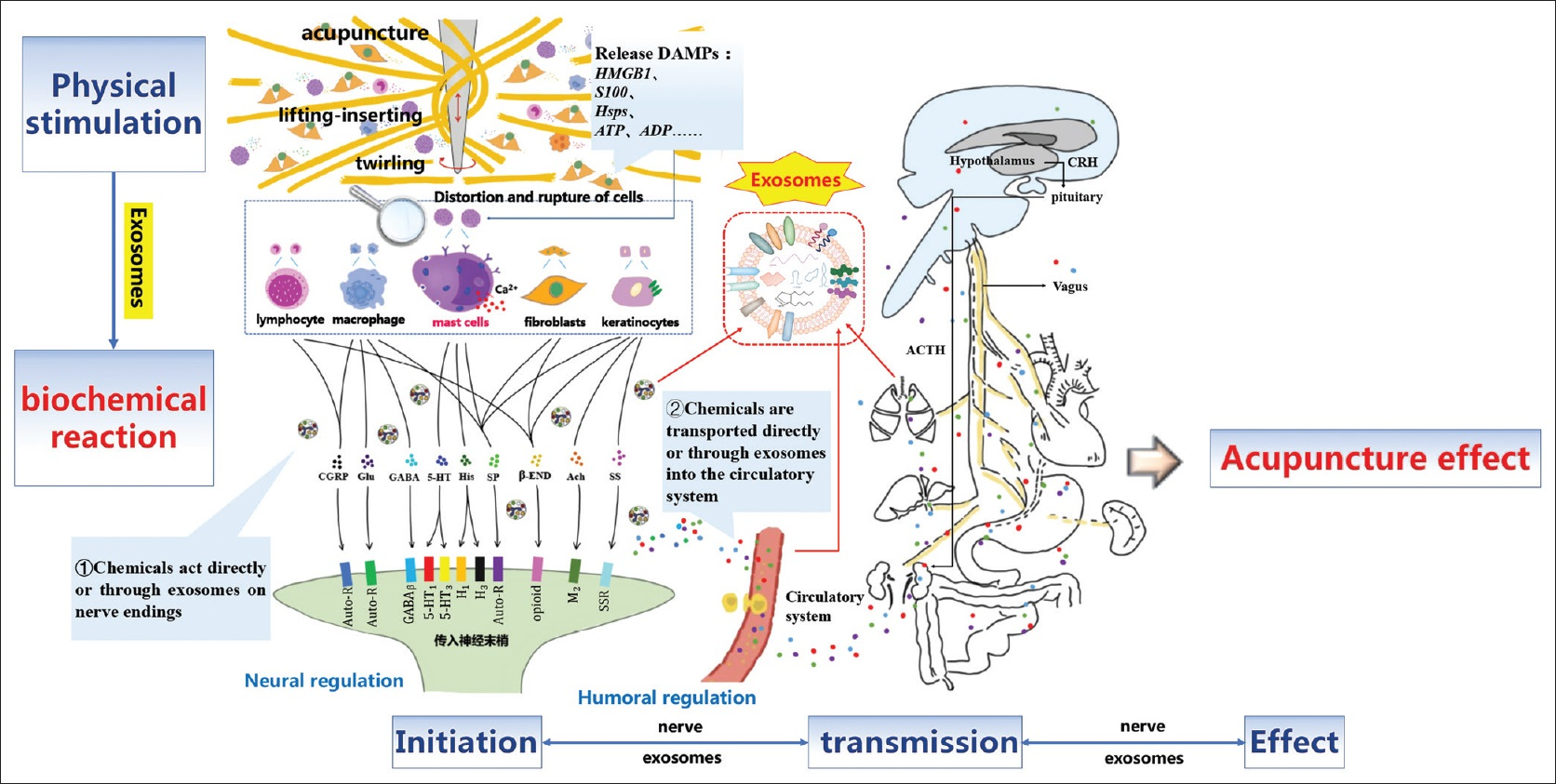 침술은 경혈 수용체를 통해 국소 신경섬유를 활성화하여 신경 조절을 시작한다. 엑소좀은 세포와 감각신경 종말 사이의 중요한 소통 방식이다.