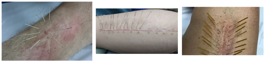 - 침(0.25mm × 30mm)을 흉터 전체를 에워싸는 모양으로 자침한다. 침의 간격은 약 0.5~1.0cm 정도로 한다.