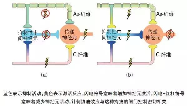 척추동물(예: 개구리) 특히 포유류에서는 통증을 조절하는 신경 구조가 척수에서 발견되었다. 1965년 Wall과 Melzack[7]은 척수 후각에 말초에서 중추신경계로 전달되는 신경 임펄스의 강도를 조절하는 관문과 같은 신경 메커니즘이 존재한다고 제안했다. 즉, 체성 감각 신호는 중추신경계에 들어가기 전에 관문을 통해 조절될 수 있다는 것이다. 관문이 통증 신호 전달을 조절하는 정도는 굵은 섬유(Aβ)와 가는 섬유(Aδ 및 C)의 상대적인 활동과 뇌의 하행 영향에 의해 결정된다. 관문을 통과하는 정보의 양이 특정 임계 수준을 초과하면 통증 경험과 통증 반응을 유발하는 신경 구조가 활성화될 수 있다. 실제로 "관문조절 이론"은 통증 정보를 전달하는 C형 섬유가 중추신경계의 상위 부분에 도달하여 통증 인식을 생성할 때, 동일 부위에서 촉각 및 압력 감각을 전달하는 A형 섬유의 영향도 받는다는 사실을 의미한다. 침술, 마사지, 도수치료, 부항, 마찰 등의 체성 자극 방법은 국소적인 A형 신경섬유를 활성화시킬 수 있다. 이러한 신경섬유의 활성화는 척수 수준에서 통증 신호 전달 경로를 차단하여 C형 신경섬유로부터의 통증 신호 전달을 막고, 결과적으로 뇌로의 통증 정보 전달을 차단하여 통증 인식을 억제한다(그림 3). 동물계에서는 상처를 핥거나 나무줄기에 몸을 비비거나 새가 아픈 부위를 쪼는 등 표면 자극을 통한 통증 완화 방법이 흔히 관찰된다. 현재까지도 이는 야생 동물이 스스로 통증을 완화하기 위해 사용하는 유일한 방법이다