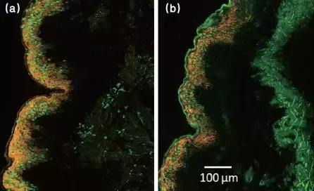 모든 생명체의 가장 바깥쪽 장벽인 피부는 오랜 진화 과정을 통해 생명체의 자기 방어 및 자가 복구 능력을 보장하기 위해 복잡한 생물학적 조절 시스템을 발전시켜 왔다. 지난 20년간 연구자들은 피부와 신경, 내분비계, 면역계 사이의 포괄적인 생물학적 상호작용 네트워크를 관찰하여 피부-뇌 축(Skin-Brain-Axis)이라는 현대적 개념을 정립했다. 피부의 대부분의 전통적인 비내분비 세포는 신경전달물질, 호르몬 또는 펩타이드를 통해 정보를 전달하고 주변 세포 또는 자체 세포에 작용하여 생리적 효과를 나타내는 분비 기능을 가지고 있다. 국소 혈자리 열(뜸) 치료 후, 표피 각질세포에서 글루코코르티코이드 수용체-α(GR-α, glucocorticoidreceptor-α)의 양성 발현은 열 자극을 가하지 않은 반대쪽 혈자리에 비해 유의하게 높았다(그림 2). 이러한 독립적인 내분비 물질을 분비하는 세포에는 각질세포, 멜라닌세포, 섬유아세포 및 메르켈 세포가 포함된다. 이러한 피부 세포의 분비 기능과 분비물은 부신피질 축, 생식선 축, 갑상선 축 및 다양한 신경활성 물질과 유사하다. 현재 가장 광범위하게 연구되고 잘 정립된 시스템은 중추 신경계와 유사한 시상하부-뇌하수체-부신피질 시스템이다. 피부 면역 기능에 대한 인간의 이해는 점진적인 발전 과정을 거쳐 왔다. 1970년 피히텔리움(Fichtelium) 등은 피부를 "일차 림프기관"으로 보고, 전구 림프구가 피부에서 분화 및 성숙하여 면역 활성 림프구가 될 수 있다고 제안했다. 1978년 스트레일라이(Streilei)는 "피부 관련 림프 조직" 개념을 제시하며 피부의 각질세포, 림프구, 랑게르한스 세포 및 혈관 내피 세포가 피부 면역에서 각기 다른 역할을 수행한다고 주장했다. 1987년 보스(Bos) 등은 피부 면역 시스템(SIS) 이론을 제안하여 면역학 발전에 지대한 영향을 미쳤다. 피부 세포에서 분비되는 면역 활성 물질에는 신체 면역체계의 세포, 사이토카인 및 분자 구성 요소의 대부분이 포함된다. 이 세포들은 다양한 사이토카인을 분비하여 면역 활성 세포의 분화 및 성숙에 유리한 미세 환경을 조성하고 면역 반응을 조절하는 역할을 한다. 또한 T림프구 세포의 아형 Th1 및 Th2 간의 균형을 유지하여 신체가 외부 이물질에 대해 적절한 면역 반응을 생성하고 면역 항상성을 유지할 수 있도록 한다.